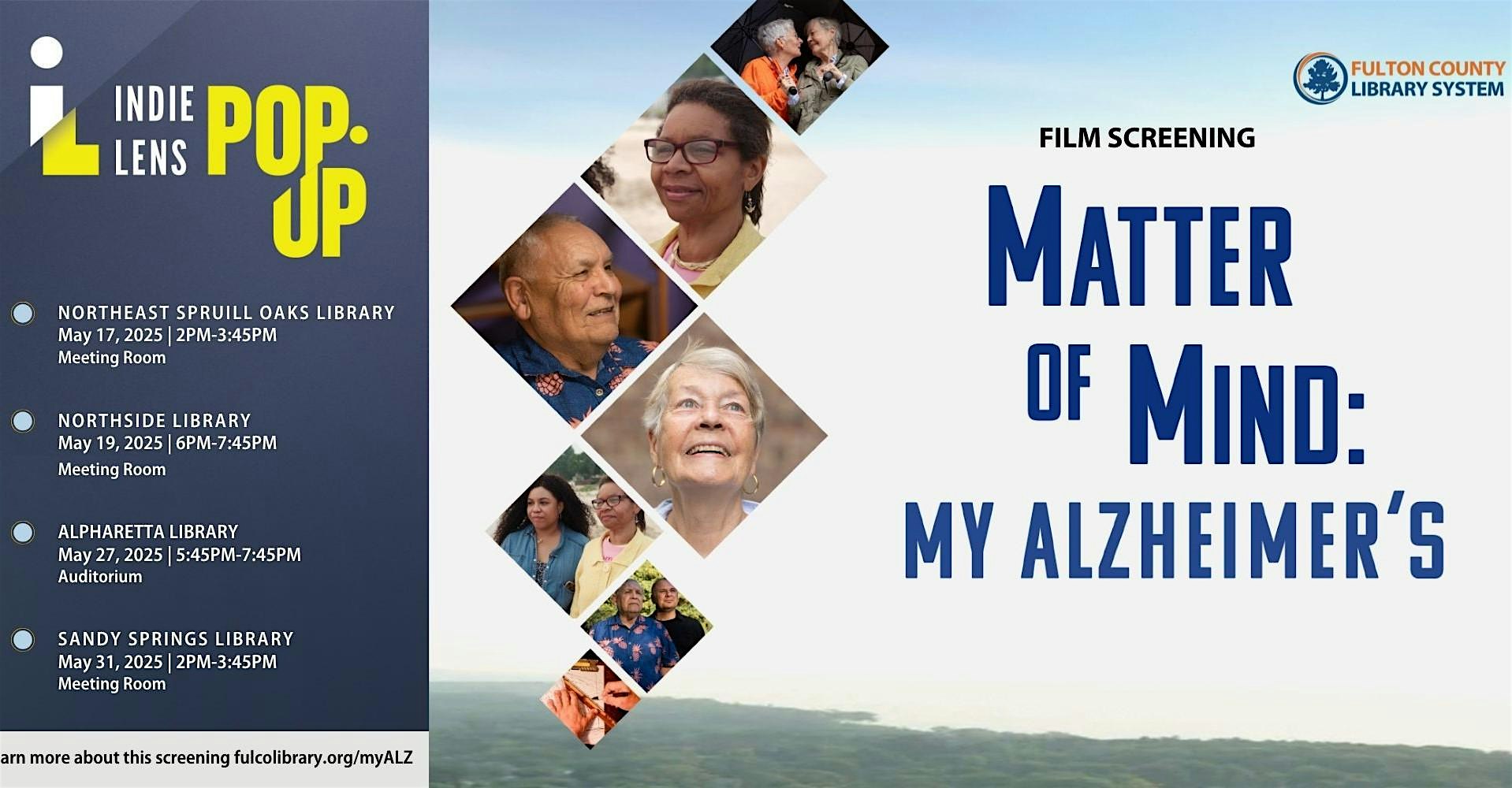 oin the Fulton County Library System, the Alzheimer’s Association and Beyond Dementia Coalition for special film screenings of Matter of Mind: My Alzheimer’s. Throughout the month of May, select branches will screen the film, followed by an engaging panel discussion with local experts and information about local support groups. Go to fulcolibrary.org/myalz or gpb.org/community for more information.